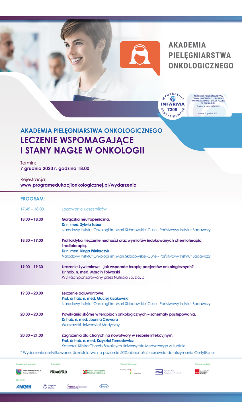 Polskie Towarzystwa Onkologii Klinicznej – organizator Programu Edukacji Onkologicznej, w ramach którego działa Akademia Pielęgniarstwa Onkologicznego – serdecznie zaprasza do bezpłatnego udziału w webinarium webinarium “LECZENIE WSPOMAGAJĄCE I STANY NAGŁE W ONKOLOGII”.