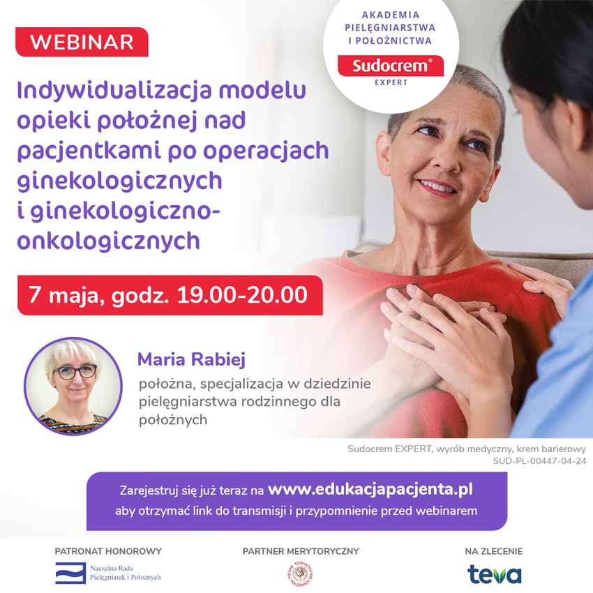 Webinar jest realizowany w ramach programu edukacyjnego Akademia Pielęgniarstwa i Położnictwa Sudocrem Expert w partnerstwie z Polskim Towarzystwem Położnych. Patronat honorowy nad programem objęła Naczelna Rada Pielęgniarek i Położnych. Partnerem programu edukacyjnego jest Teva.